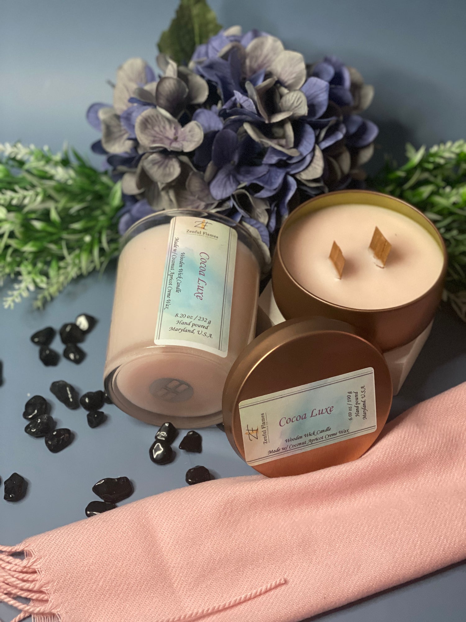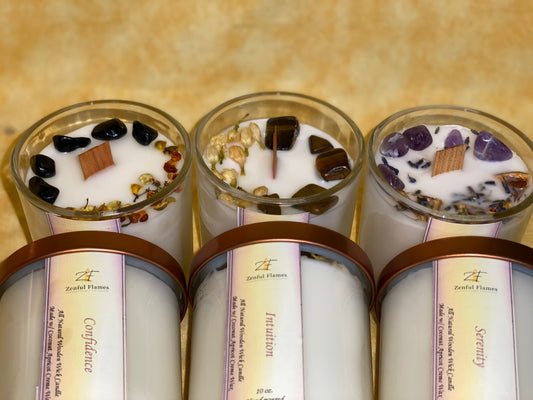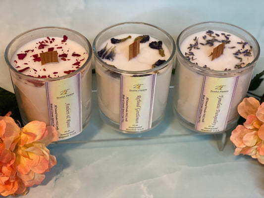Experience the beauty of nature with our Flora Candle Collection. Made with a toxin-free and vegan-friendly base of coconut apricot crème wax, and natural coloring from the wax itself, our candles are not only eco-friendly but also safe for you and your home. Each candle is expertly blended with 1-4 premium fragrance oils to create a soothing and relaxing aroma, transporting you to a peaceful and calm place.To complete your Zenful experience, our Flora Candle Collection features a dried flower as a beautiful and natural touch, adding an extra layer of serenity to your space.